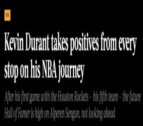 “我不会说那段经历是种挑战。我可是在NBA打球,”杜兰特说,“我当时身体状态依然良好,既能继续打磨球技,也能在比赛中全力以赴。我不会用负面的眼光看待那段经历。能在NBA打球,我任何时候都感到开心。我喜欢在菲尼克斯打球,曾以为自己会在那里退役。现在我也喜欢在休斯顿打球。”