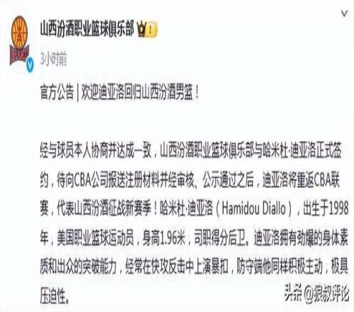 媒体人:山西重签迪亚洛支付了两笔钱CBA能够审查的仅是第二笔钱