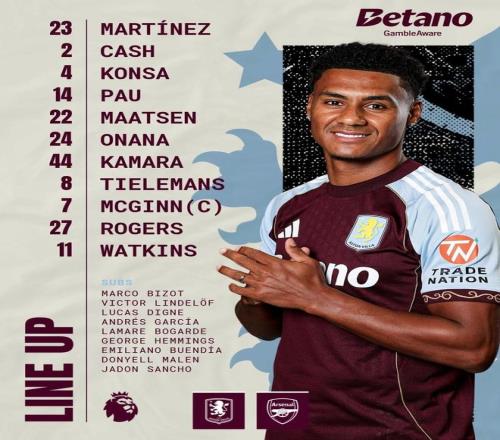阿斯顿维拉首发:23-达米安-马丁内斯、2-卡什、4-孔萨、14-保-托雷斯、22-马特森、24-阿马杜-奥纳纳、44-布巴卡尔-卡马拉、8-蒂勒曼斯、7-麦金、27-摩根-罗杰斯、11-沃特金斯
